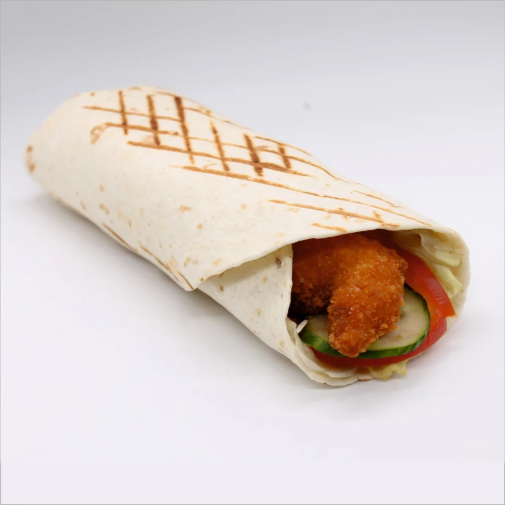 Тортилья, соус цезарь, салат Айсберг, огурец свежий, креветки в панировке, томат.