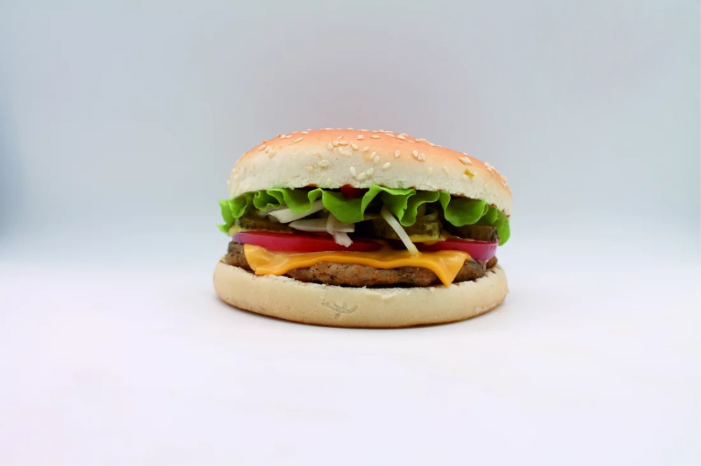 Булочка, ломтик сыра Чеддер, салат Айсберг, свежий томат, маринованный огурец, маринованный лук, майонез/кетчуп/горчичный соус, котлета из мясного фарша.