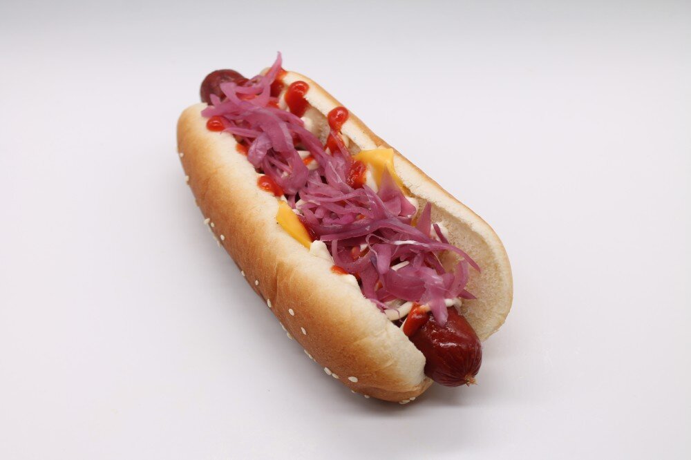 Булочка с кунжутом и сосиска, обжаренные на гриле, ломтик сыра Чеддер, лук, майонез, кетчуп, горчичный соус.