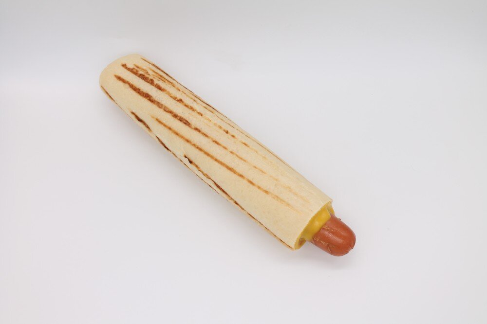 Французский багет и сосиска, обжаренные на гриле, кетчуп, горчичный соус, майонез.