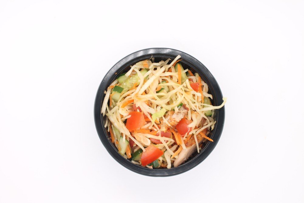 Овощная заготовка (капуста, морковь, зелень), курица, томат, свежий огурец, морковь по-корейски. Заправка на выбор: масло/сметанно-чесночный соус/майонез.