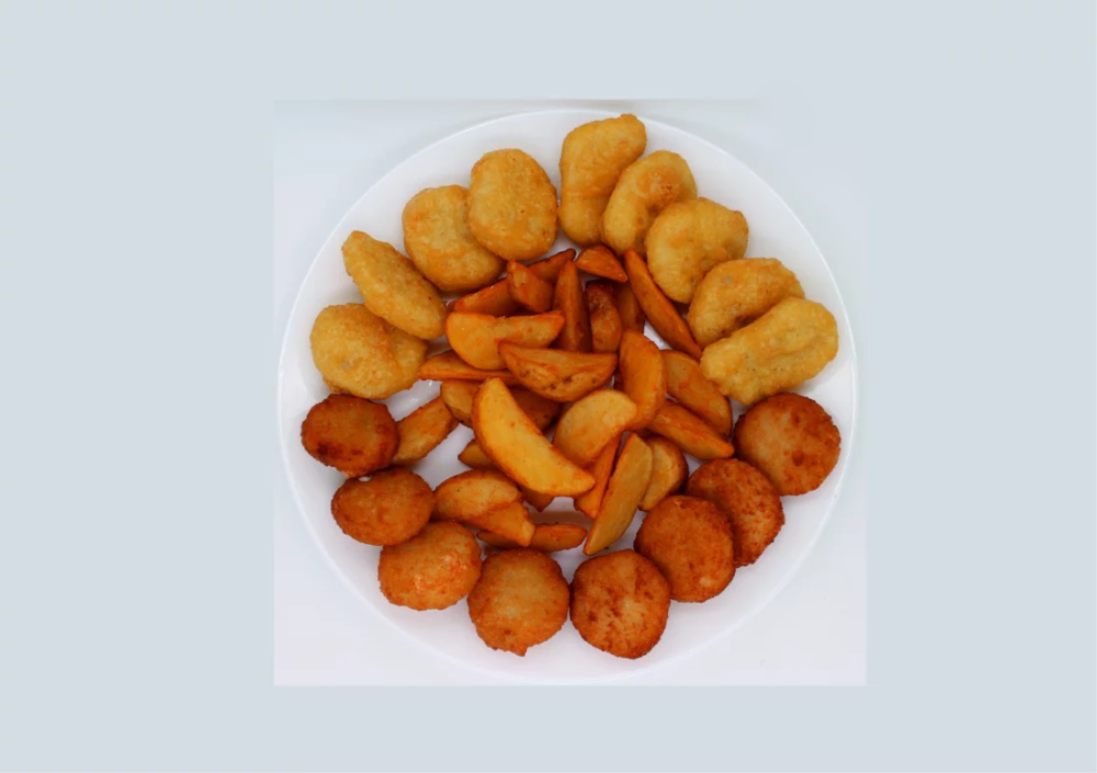 Картофель по-деревенски (150 г), куриные наггетсы (180 г), сырные монетки/шарики классические + острые (120 г).