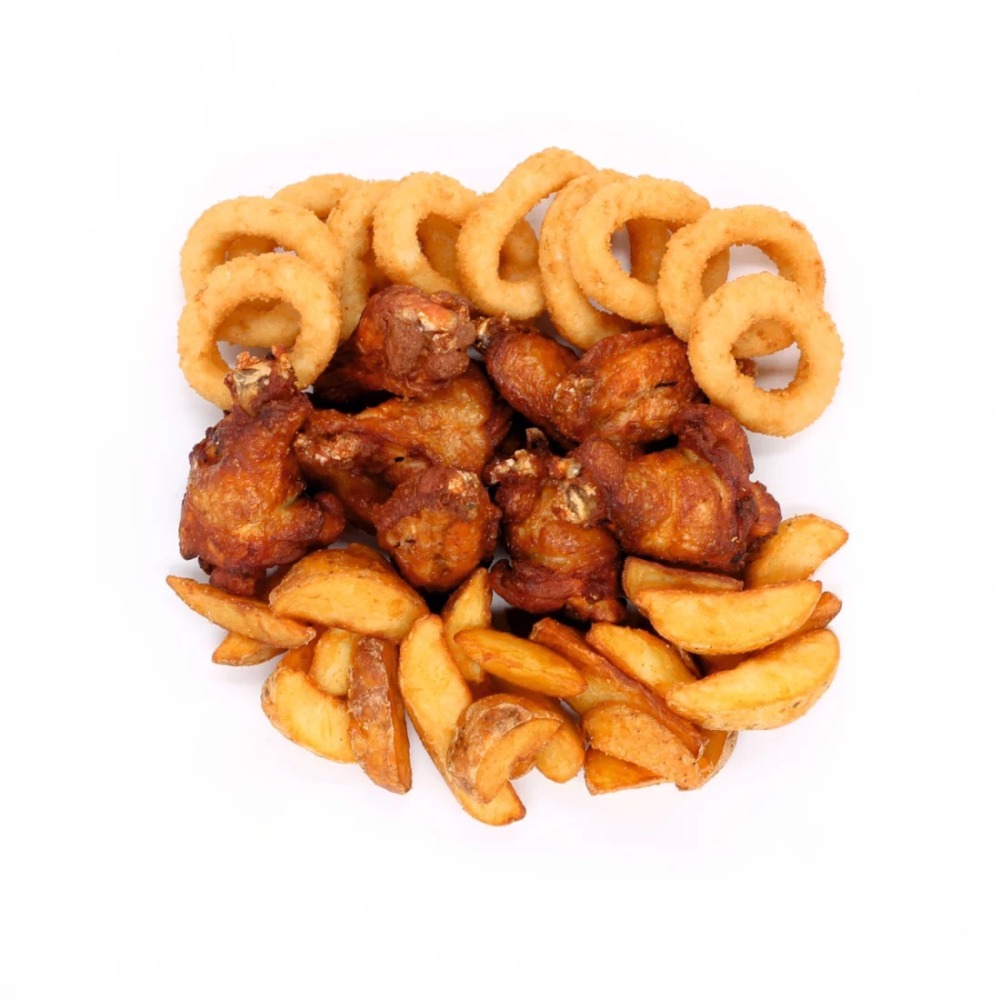 Картофель по-деревенски (150 г), луковые кольца (130 г), куриные крылья «Золотой гриль» (130 г, плечевая часть), куриные крылья «Баффало» (130 г, плечевая часть).