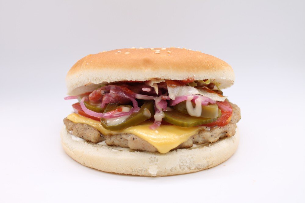 Булочка, ломтик сыра Чеддер, свежий томат, маринованный огурец, салат Айсберг, маринованный лук, бургерный соус, котлета из мясного фарша.